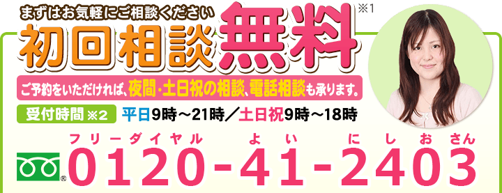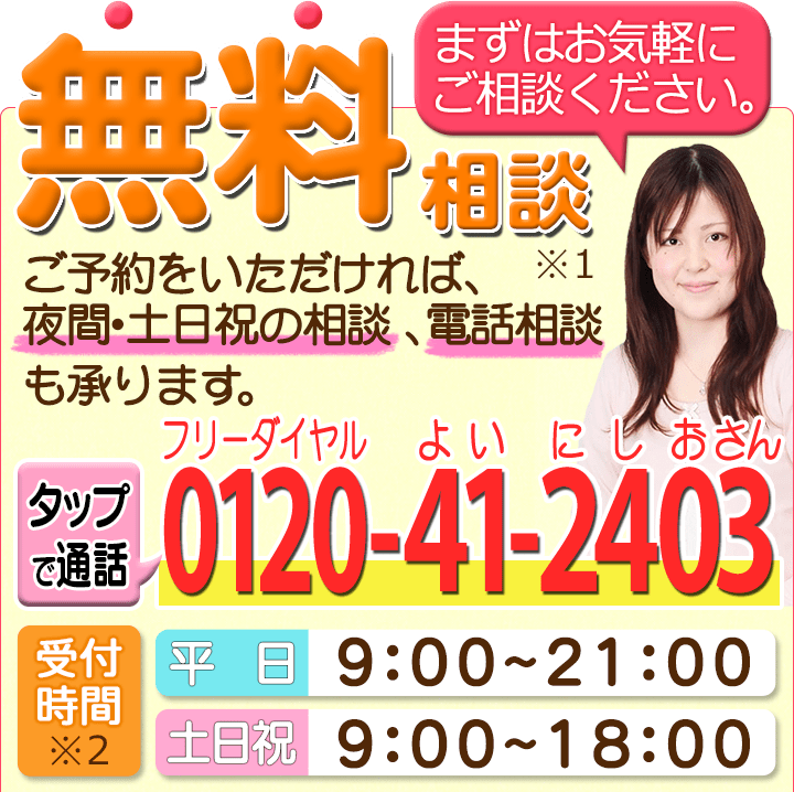 トップその他共通バナー元※消さない 階層構造▼ その他(目次) 共通バナー元※消さない その他(目次)その他トップ共通バナー元※消さない心グループニュース(新着情報)関連リンクお役立ちリンクプライバシーポリシー 受付時間 平日 9時~21時、土日祝 9時~18時 夜間・土日祝の相談も対応します (要予約) 所在地 〒111-1111 ●町●●建物● 0120-41-2403 お問合せ・アクセス・地図