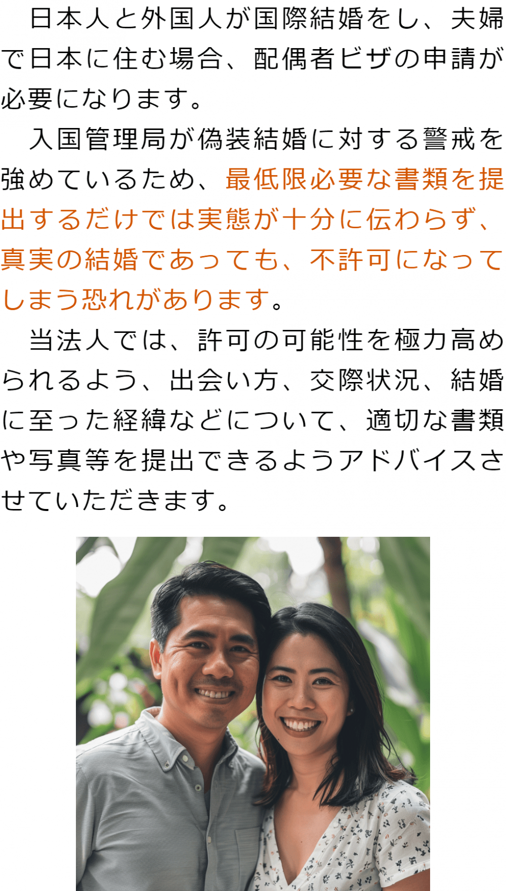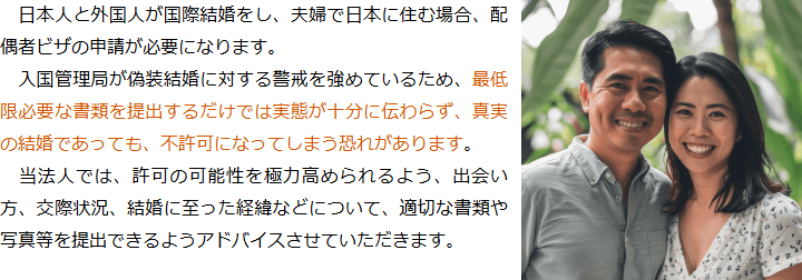 トップビザの種類別サービス内容国際結婚・配偶者ビザ 階層構造▼ ビザの種類別サービス内容(目次) 国際結婚・配偶者ビザ 詳細につきましては、以下のサイトをご覧ください(以下のボタンをクリック)。 ビザの種類別サービス内容(目次)ビザの種類別サービス内容トップ特定技能(就労ビザ)技術・人文知識・国際業務(就労ビザ)就労ビザ(その他)経営管理ビザ国際結婚・配偶者ビザ永住権定住者ビザ家族滞在ビザ短期滞在ビザ帰化申請留学ビザ資格外活動許可インターンシップビザ企業内転勤ビザ高度専門職在留特別許可 受付時間 平日 9時~21時、土日祝 9時~18時 夜間・土日祝の相談も対応します (要予約) 所在地 〒111-1111 ●町●●建物● 0120-41-2403 お問合せ・アクセス・地図