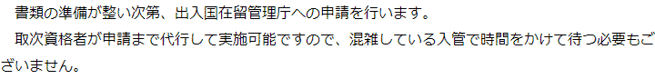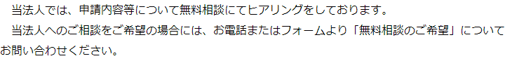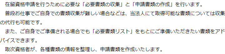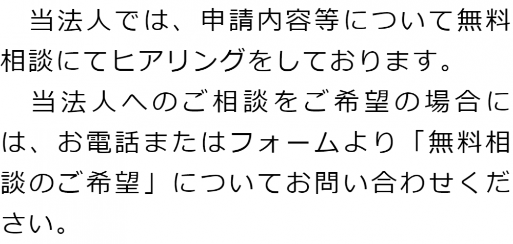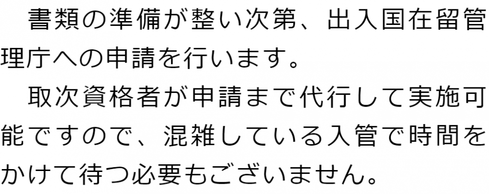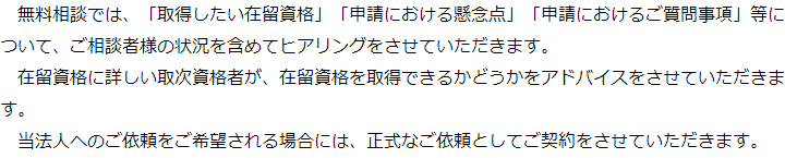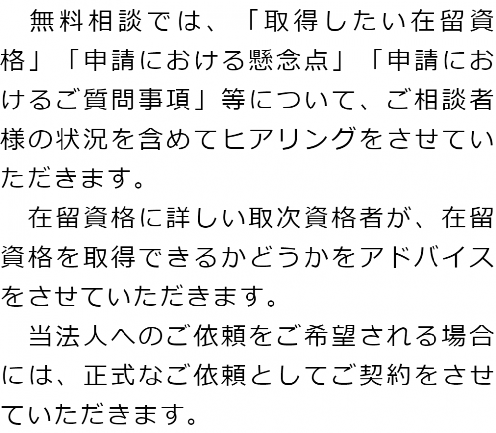 トップご依頼の流れ 階層構造▼ ご依頼の流れ①無料相談のご予約②無料相談③申請に向けた準備④出入国在留管理庁への申請取次⑤許可取得後在留カードを受領/ご依頼者様へお渡し/費用のお支払い ①無料相談のご予約②無料相談③申請に向けた準備④出入国在留管理庁への申請取次⑤許可取得後在留カードを受領/ご依頼者様へお渡し/費用のお支払い 受付時間 平日 9時~21時、土日祝 9時~18時 夜間・土日祝の相談も対応します (要予約) 所在地 〒111-1111 ●町●●建物● 0120-41-2403 お問合せ・アクセス・地図