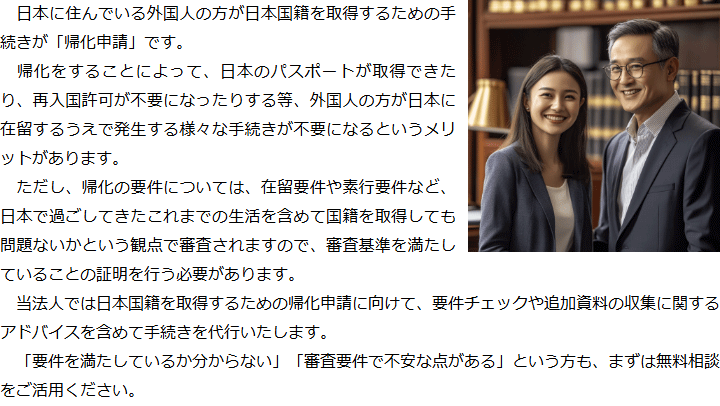 トップビザの種類別サービス内容帰化申請 階層構造▼ ビザの種類別サービス内容(目次) 帰化申請 詳細につきましては、以下のサイトをご覧ください(以下のボタンをクリック)。 ビザの種類別サービス内容(目次)ビザの種類別サービス内容トップ特定技能(就労ビザ)技術・人文知識・国際業務(就労ビザ)就労ビザ(その他)経営管理ビザ国際結婚・配偶者ビザ永住権定住者ビザ家族滞在ビザ短期滞在ビザ帰化申請留学ビザ資格外活動許可インターンシップビザ企業内転勤ビザ高度専門職在留特別許可 受付時間 平日 9時~21時、土日祝 9時~18時 夜間・土日祝の相談も対応します (要予約) 所在地 〒111-1111 ●町●●建物● 0120-41-2403 お問合せ・アクセス・地図