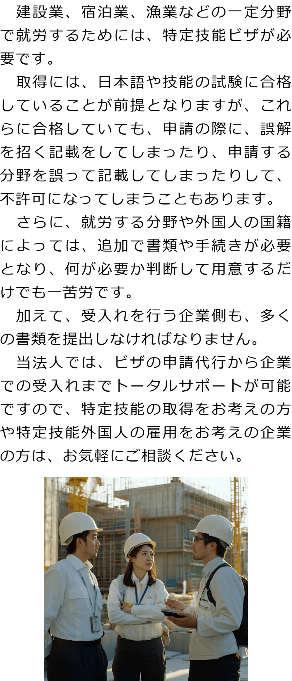 トップビザの種類別サービス内容特定技能(就労ビザ) 階層構造▼ ビザの種類別サービス内容(目次) 特定技能(就労ビザ) ビザの種類別サービス内容(目次)ビザの種類別サービス内容トップ特定技能(就労ビザ)技術・人文知識・国際業務(就労ビザ)就労ビザ(その他)経営管理ビザ国際結婚・配偶者ビザ永住権定住者ビザ家族滞在ビザ短期滞在ビザ帰化申請留学ビザ資格外活動許可インターンシップビザ企業内転勤ビザ高度専門職在留特別許可 受付時間 平日 9時~21時、土日祝 9時~18時 夜間・土日祝の相談も対応します (要予約) 所在地 〒111-1111 ●町●●建物● 0120-41-2403 お問合せ・アクセス・地図