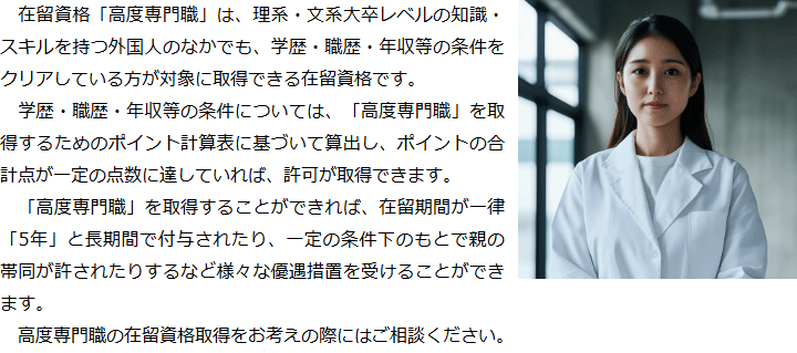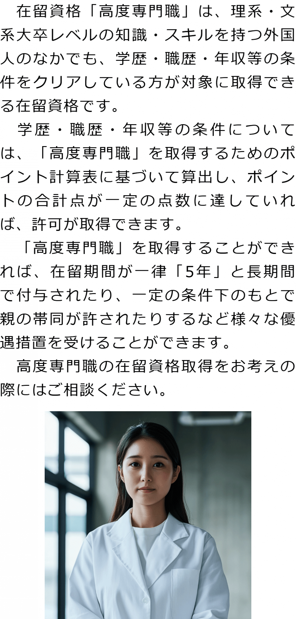 トップビザの種類別サービス内容高度専門職 階層構造▼ ビザの種類別サービス内容(目次) 高度専門職 ビザの種類別サービス内容(目次)ビザの種類別サービス内容トップ特定技能(就労ビザ)技術・人文知識・国際業務(就労ビザ)就労ビザ(その他)経営管理ビザ国際結婚・配偶者ビザ永住権定住者ビザ家族滞在ビザ短期滞在ビザ帰化申請留学ビザ資格外活動許可インターンシップビザ企業内転勤ビザ高度専門職在留特別許可 受付時間 平日 9時~21時、土日祝 9時~18時 夜間・土日祝の相談も対応します (要予約) 所在地 〒111-1111 ●町●●建物● 0120-41-2403 お問合せ・アクセス・地図
