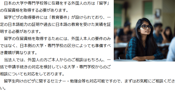 トップビザの種類別サービス内容留学ビザ 階層構造▼ ビザの種類別サービス内容(目次) 留学ビザ ビザの種類別サービス内容(目次)ビザの種類別サービス内容トップ特定技能(就労ビザ)技術・人文知識・国際業務(就労ビザ)就労ビザ(その他)経営管理ビザ国際結婚・配偶者ビザ永住権定住者ビザ家族滞在ビザ短期滞在ビザ帰化申請留学ビザ資格外活動許可インターンシップビザ企業内転勤ビザ高度専門職在留特別許可 受付時間 平日 9時~21時、土日祝 9時~18時 夜間・土日祝の相談も対応します (要予約) 所在地 〒111-1111 ●町●●建物● 0120-41-2403 お問合せ・アクセス・地図
